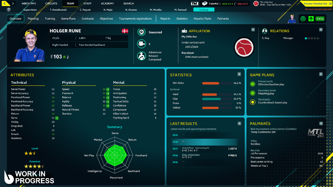 As we explained in our previous article about our scouts, we make it a point of honor to update our database and make it as accurate as possible to the current circuit. Attributes per shot, player profile, preferred game plans... All this information is regularly analyzed and updated by our expert partners. Finally, in addition to updating the existing players, it is fundamental that our game integrates all the new players, especially those with an interesting potential of progression. This is why we are in constant contact with our scouts who, dispatched in the 4 corners of the world, inform us and warn us of the appearance of a potential wonderkid.