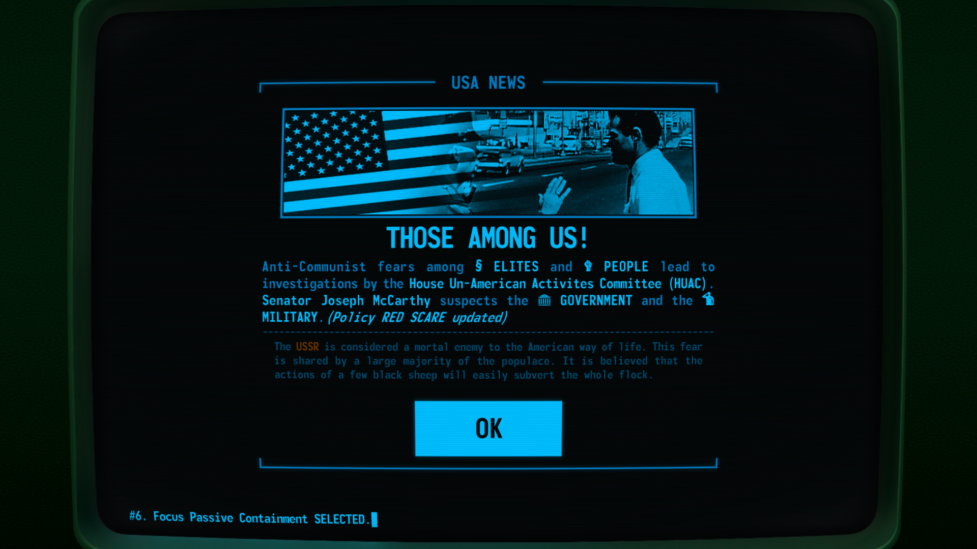 If the focus 'Passive Containment' is selected, the House Un-American Activities Committee (HUAC) starts its investigations and tries to unmasks communist agents in the US. At that point, you can orient the committee towards the Army or the Department of State. If the Army is chosen, it will lead to an investigation into the so-called 'Dixie Mission', a group sent to contact Chinese communists during the Second World War. This can evolve in various ways, depending on the targets of the anger of HUAC but rest assured your domestic Military interest will have to pay a price for their treachery. Leading to conflicts between Joseph McCarthy and various other historical characters, if the strategic military capabilities are impacted by the investigations, General Curtis Lemay will not be far behind. Will you be reminded of your need to protect his nuclear reactions force so that the simulation of the next world war has a favorable US outcome?