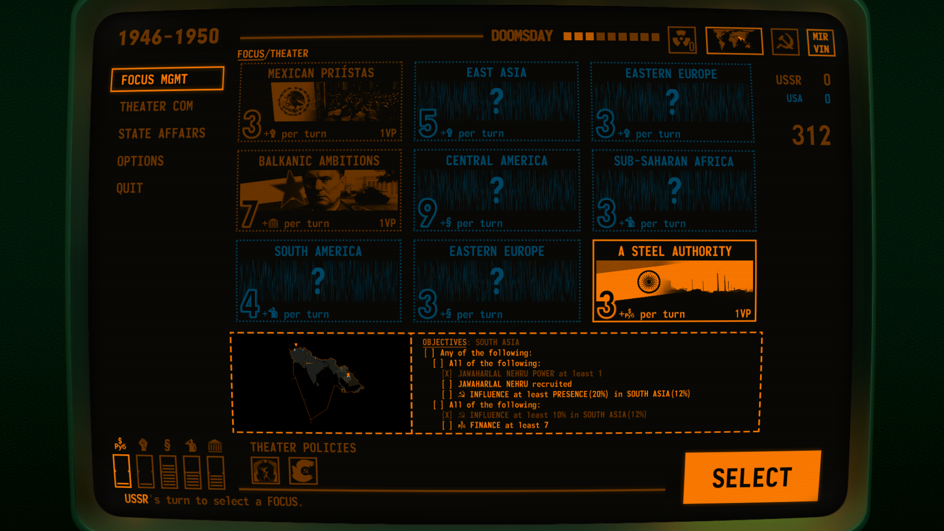 Hold your breath though, as despite being a good possible route for the USSR, you cannot deploy there yet, as the region is non-aligned and Soviet influence there is zero. Looking elsewhere in the theater, Western India is the second closest to the Soviet border and possesses a friendly presence.