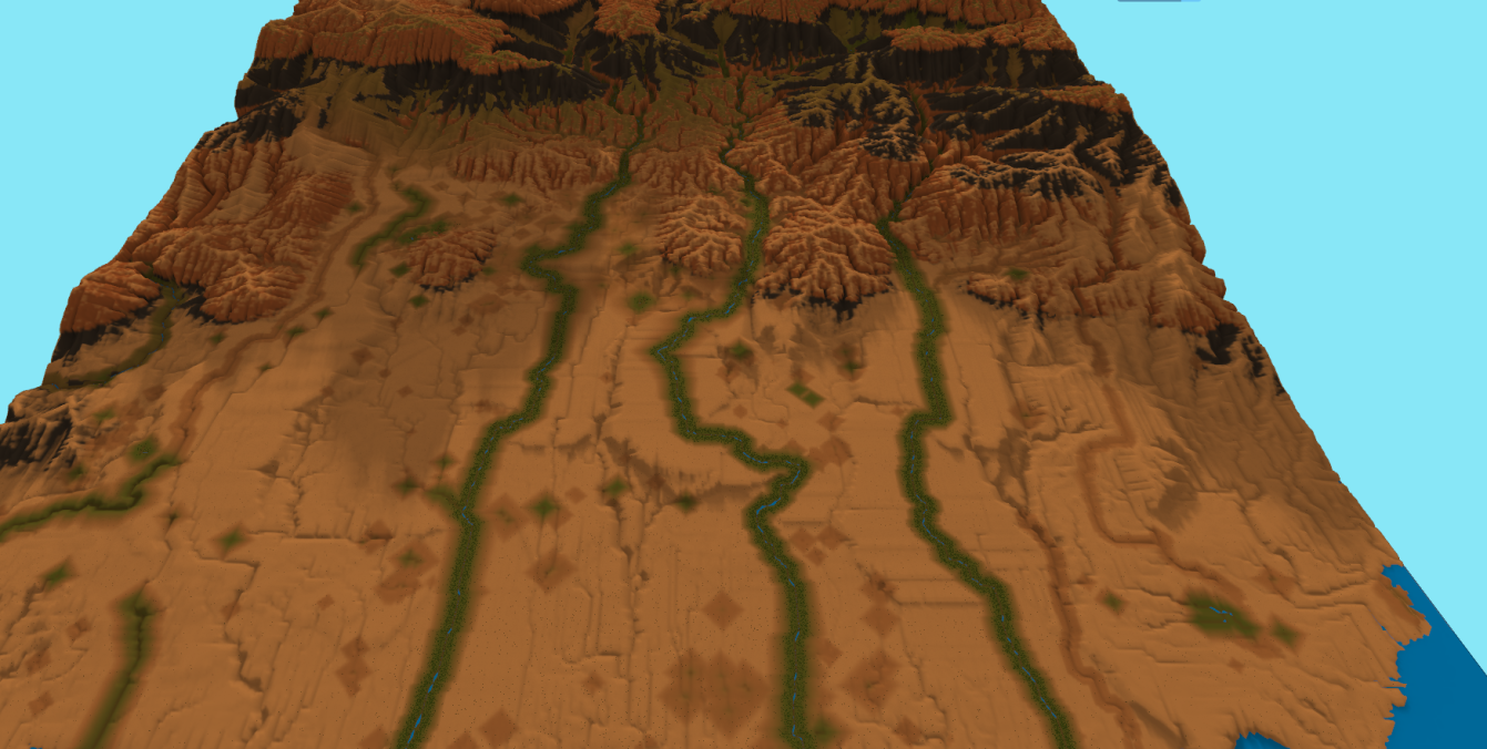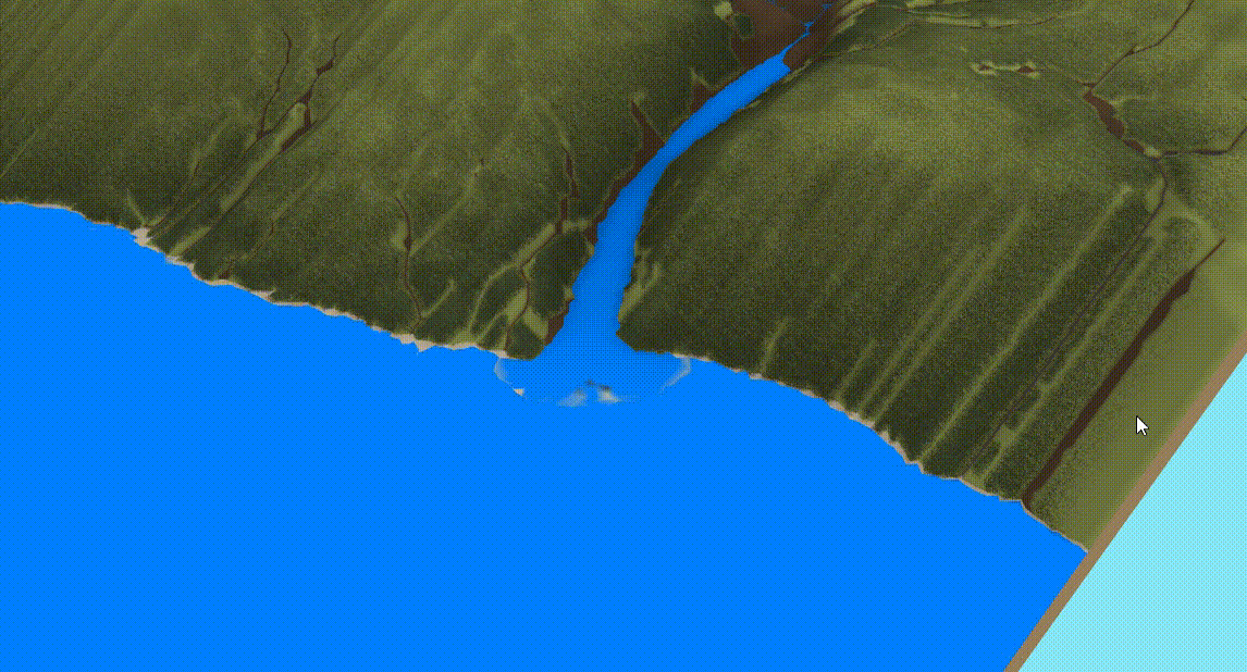 The way that rivers build up land from sedimentation has been reworked with separate small particle and large particle erosion and sedimentation taking place. These separate effects allow rivers to build levees which significantly alter the behaviour of rivers, especially in low-lying flood prone areas. Where rivers would previously form one uniform, very flat delta with identical flow across it, rivers now properly wind their way to the ocean, periodically overflowing their banks and changing direction as a different area is built up. Thank you to players on the discord who contributed to the new simulation, especially Radnugget for their insight into river levee formation.