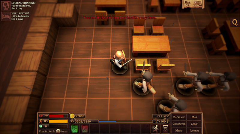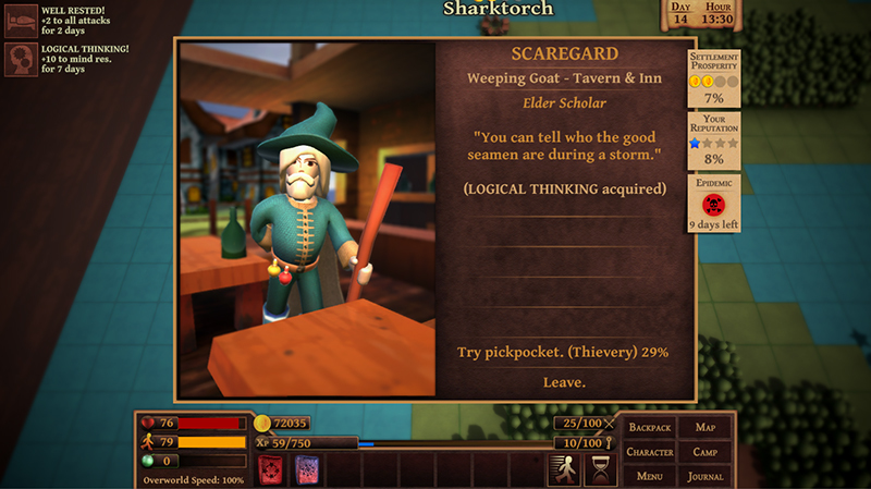 One of them is an Elder Scholar who gives Logical Thinking effect to the hero if you buy him a meal. Logical Thinking is a major effect that lasts for several days. It gives +10 mind resistance. The scholar also tells a life lesson every time you buy him a meal. We intended to make these life lessons procedural but it didn’t generate well enough so for now they are hand written (we may try again in the future).