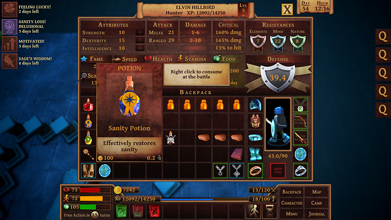 Hi everyone, We are ready with a new update. As we mentioned earlier, we put some Sanity Loss effects and Diseases that our hero can get. These last for several days and give some negative stats to our hero. For example “Superstitious” gives -10 to mind resistance. More detailed explanations are below. These effects are not very powerful but they last long.