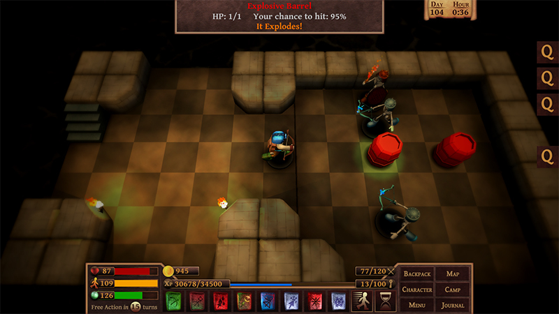 We will be adding different kinds of barrels too. One of them is Poison Barrel, which poisons adjacent squares when shot at. Another one we think to add is Arctic Barrel. This will freeze all around itself when the hero shoots it. Last but not least, we are considering Barrel of Nails which bleeds adjacent enemies -if they can bleed, that is.