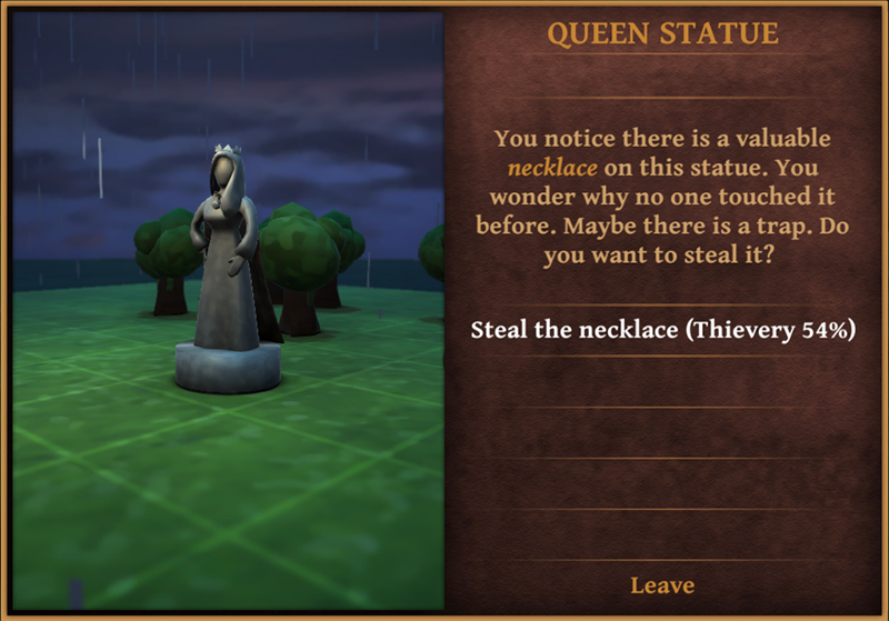 With the last update, we introduced 3 statues which give some attribute bonuses for a small donation. But we were planning more interactions with different statues. This week we worked on one of them, which is a queen statue. This statue has a valuable necklace on it. But it is suspicous because nobody stole it for many years. The hero can attempt to steal it with a successful thievery check. There is a poison trap on the statue. If thievery check fails, hero will get poisoned. There may be other surprise mechanisms attached to it too. This statue will come up on the overworld or at the dungeons like the other statues.