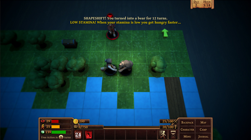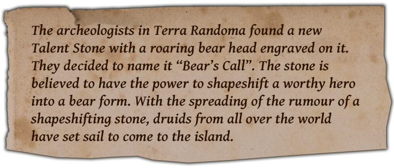 "Bear's Call" talent stone: Hero turns into a bear and gains increased attack and damage. Hero consumes more food when in bear form. He can’t open backpack. Slimes can’t break his equipment.