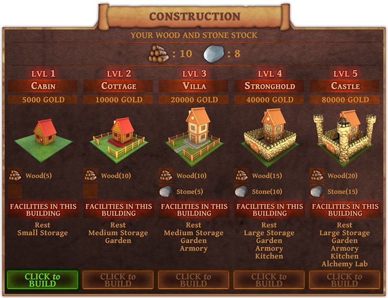 It will start small with a wooden cabin at first level. Then it will be a cottage, a villa, a stronghold and at the fifth level, it will be a glorious castle. Every level of the building will have different facilities. Cabin will only have a small storage and a bed to rest. On the other hand, the castle will have everything from the kitchen that gives free cooked food to an alchemy lab that gives free potions! You can check out the construction menu below for details. Note that these initial plans are subject to change when we fully implement it and play it some for testing.