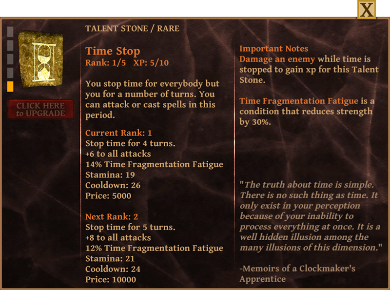Hero will be able to stop time and damage enemies while they are helplessly frozen in time. What makes this talent stone powerful is that you can hit them multiple turns before time starts passing for them. Of course this is a powerful talent stone so there is a catch: A slim chance of getting a major negative effect called “Time Fragmentation Fatigue” which reduces strength of the hero. This chance can be reduced by leveling up the stone. See below the details: