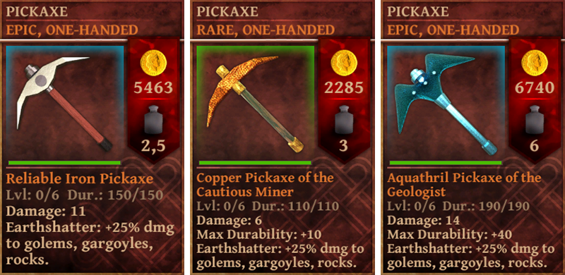 Since we are smashing rocks and mining ores in the game, lots of players wanted pickaxes. I thought there is no need to wait for a bigger update to implement these. So I made 6 pickaxes. Pickaxes has the “Earthshatter” trait, meaning they inflict 25% more damage to golems, gargoyles and rocks. They can be found everywhere in the world like normal weapons.