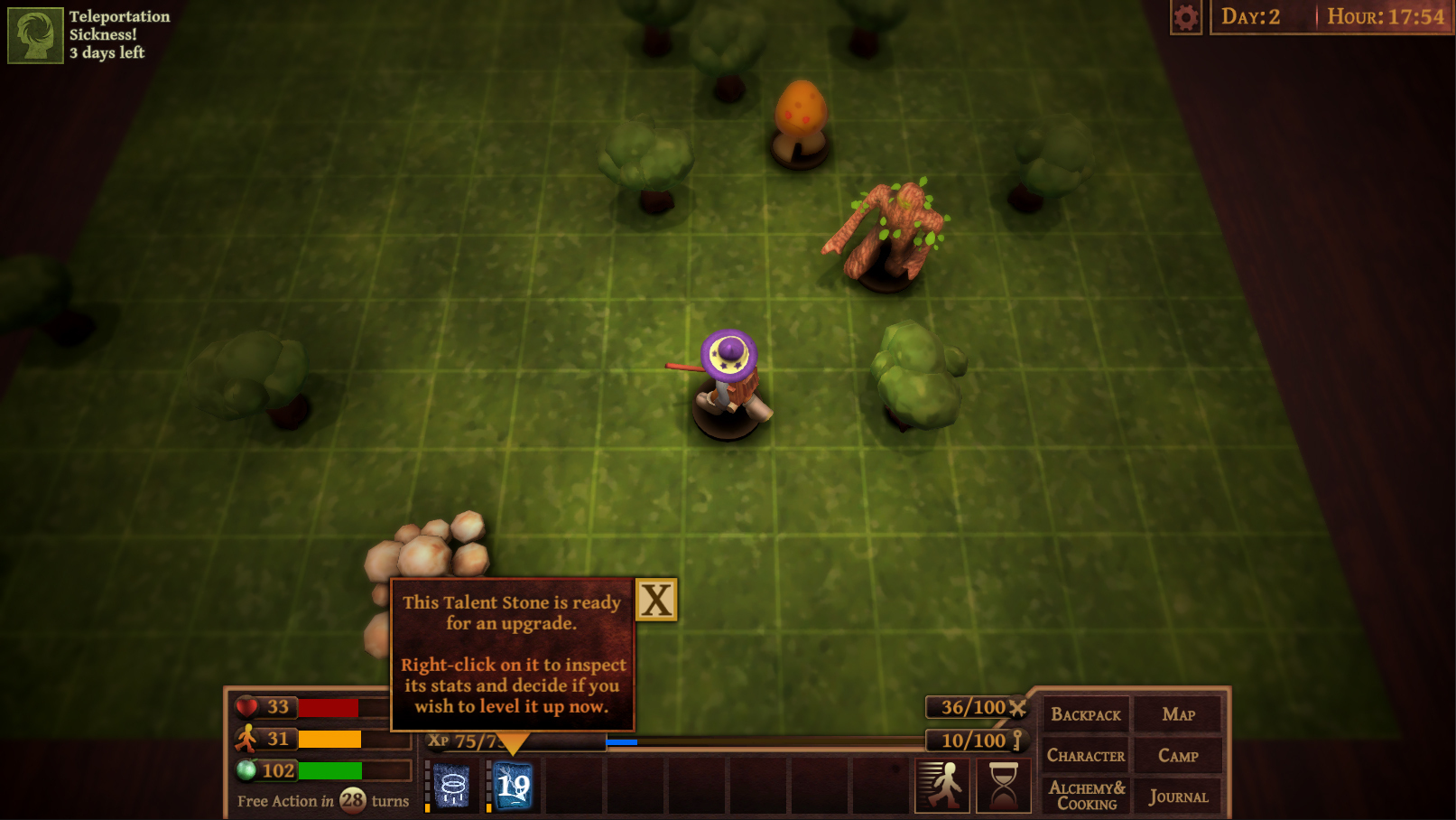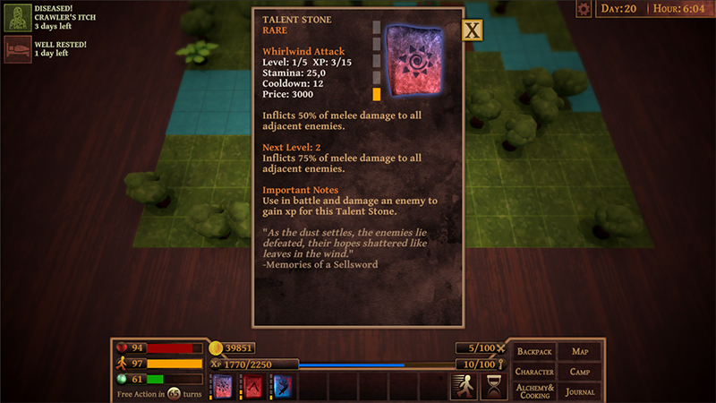 Teleport talent stone was kind of tricky. It is not an offensive or defensive spell and it is instantenous. It can be spammed to gain xp faster than usual. So now there is a “Teleportation Sickness” which is a kind of nausea. It lowers the dexterity of the hero. Like all diseases, this can be cured by cure disease potion.