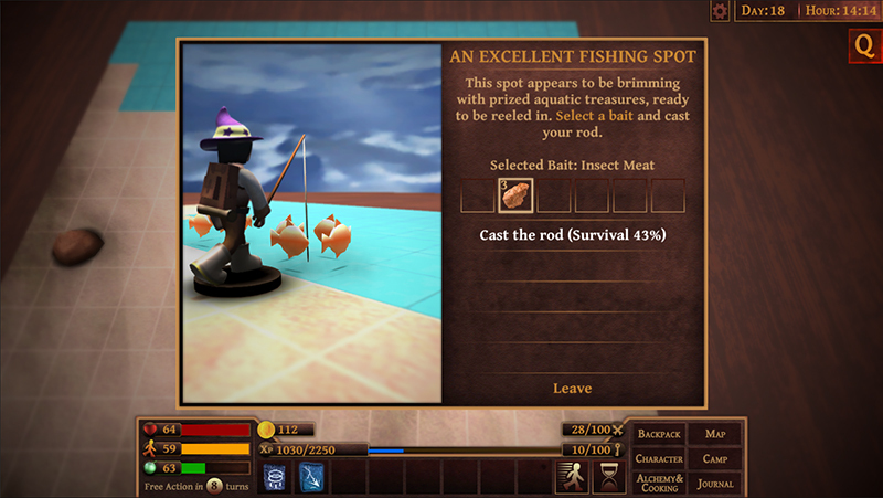 Fishing will be governed by intelligence and wilderness survival skill. Whenever the hero camps near a water tile, he can choose to search for a fishing spot. He needs a bait to start fishing. There will be several kinds of baits with different qualities. The baits will vary from common and cheap to very rare and expensive. Also, it will be easier to fish while it is raining.