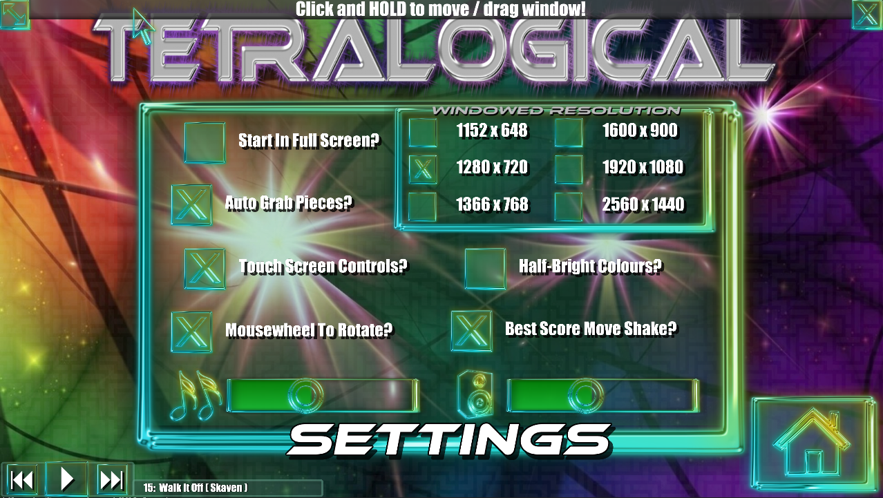 2) I've also added a 'ghosted' title bar window dragging control (which becomes visible when hovered over, at the very top of the window!), so if you are in Windowed mode, you can click, hold and drag the TetraLogical game window around to wherever you'd prefer it!