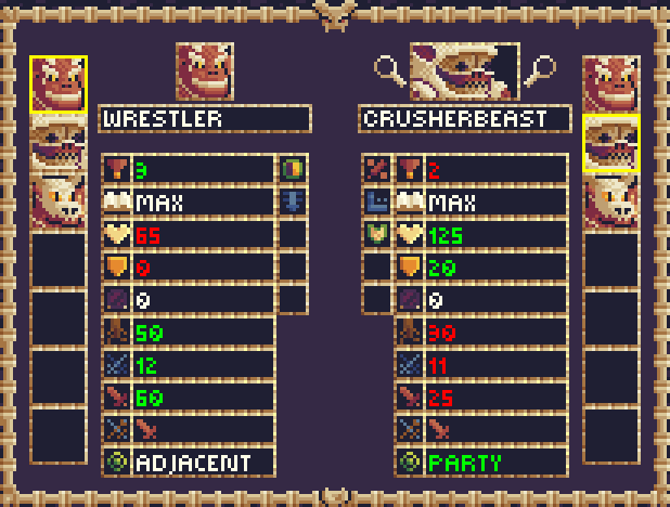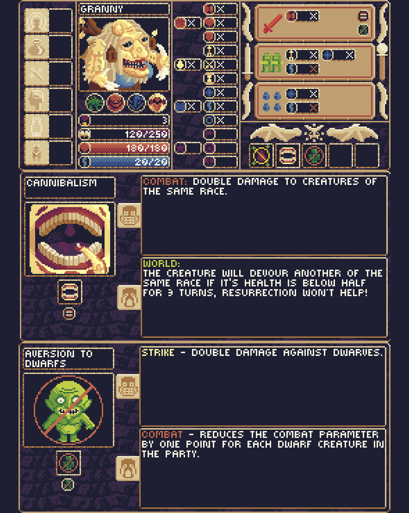 The second one was inspired by videos of people playing similar games, so why not add a window of comparison? columns of both sides with portraits is the last looked info of current creatures, such an option will be available from the window of creature info :