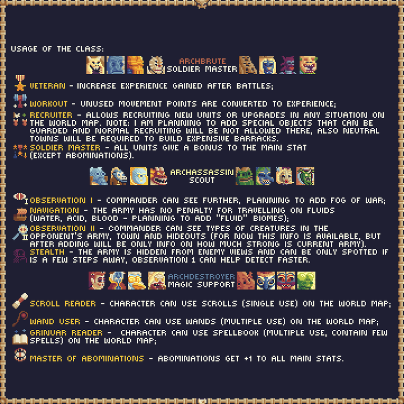 A.I.: - Added: Can charge an enemy player with an experienced team. - Fixed: uses starting bonuses; - Fixed: doesn't close the game when he decided to select an item as starting bonus; - Fixed: the priority of attacking cities and parties on the map is higher than attacking hideouts, it was equal before and now due to hideouts respawning, the AI could get stuck on the map visiting the same locations; - Added: doesn't go to the shop if he can't make any purchases; - Fixed: the priority of the defensive player was to expand the city first, then magic, and finally recruit an additional commander, now the last action is in the first place - Added: doesn't return to town when he has a unit to upgrade and can't afford it - Fixed: AI units' states are cleared, by right-clicking on their team it was possible to get information on how much experience they gained from the last fight; - Added: does not return to the city when he has a wounded or dead unit when he has no resources for healing; - Added: scout party doesn't return to the city to buy new characters; - Added: when after finishing party management, it turns out that there are no more of them (because, for example, he lost a fight), it buys in the same turn, earlier it could have caused the AI to expand the city without having parties, which paralyzed it for several turns in terms of recruiting new team; - Added: buys an additional shooter or mage to the rear column if there are only 2 warriors in front with e.g. a melee mage;