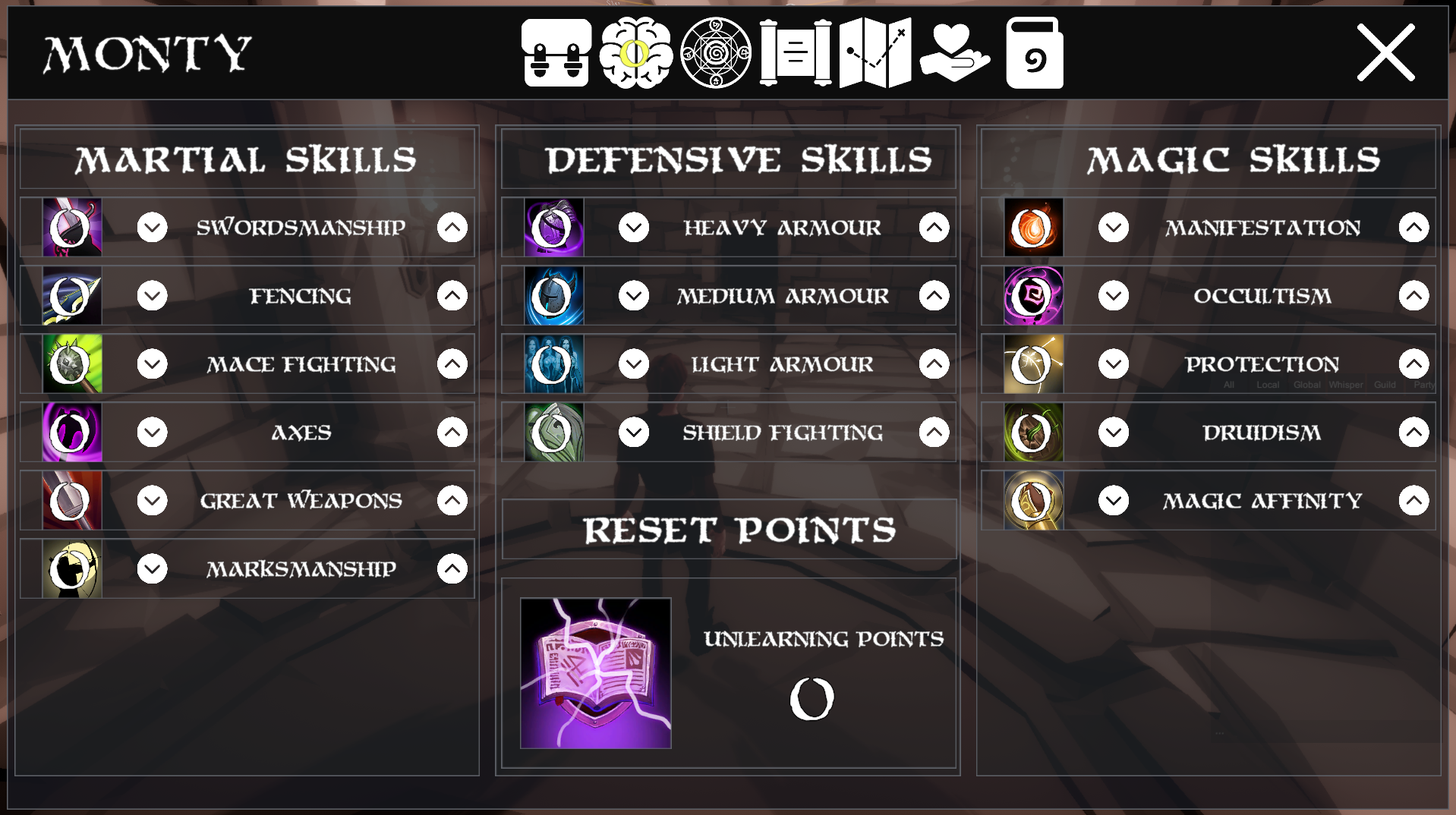 On the left side you have your martial skills these are related to melee and ranged weapons, in the middle you have some armour types and shields and on the right you have a variety of schools of magic.