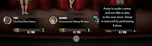 After every given show based on the show outcome, one of the performing artists can receive the ‘Stressed’ effect. ‘Stress’ will make the artist unable to participate in the next show until the effect is not removed/ cured. The main goal of the feature is to encourage the rotation of the troupe members between the shows.