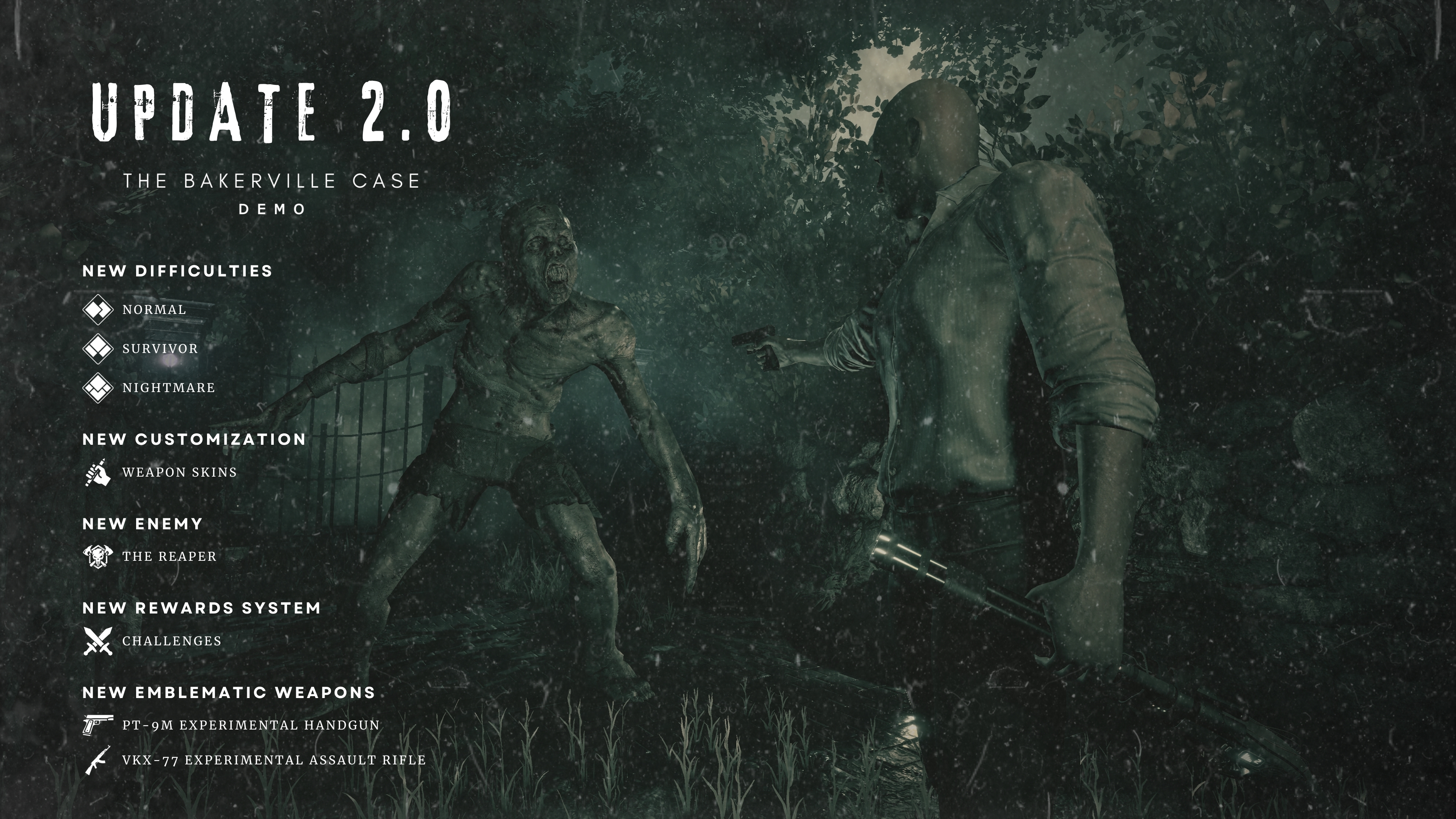 We'd like to announce that we're already working on adding Normal, Survivor, and Nightmare difficulties to the demo for more variety and replayability. Also, the weapon skin system will be included in this update, and all skins will be included for free. Additionally, we'll be adding a new enemy: the Reaper, when the update is released, we'll give more details.