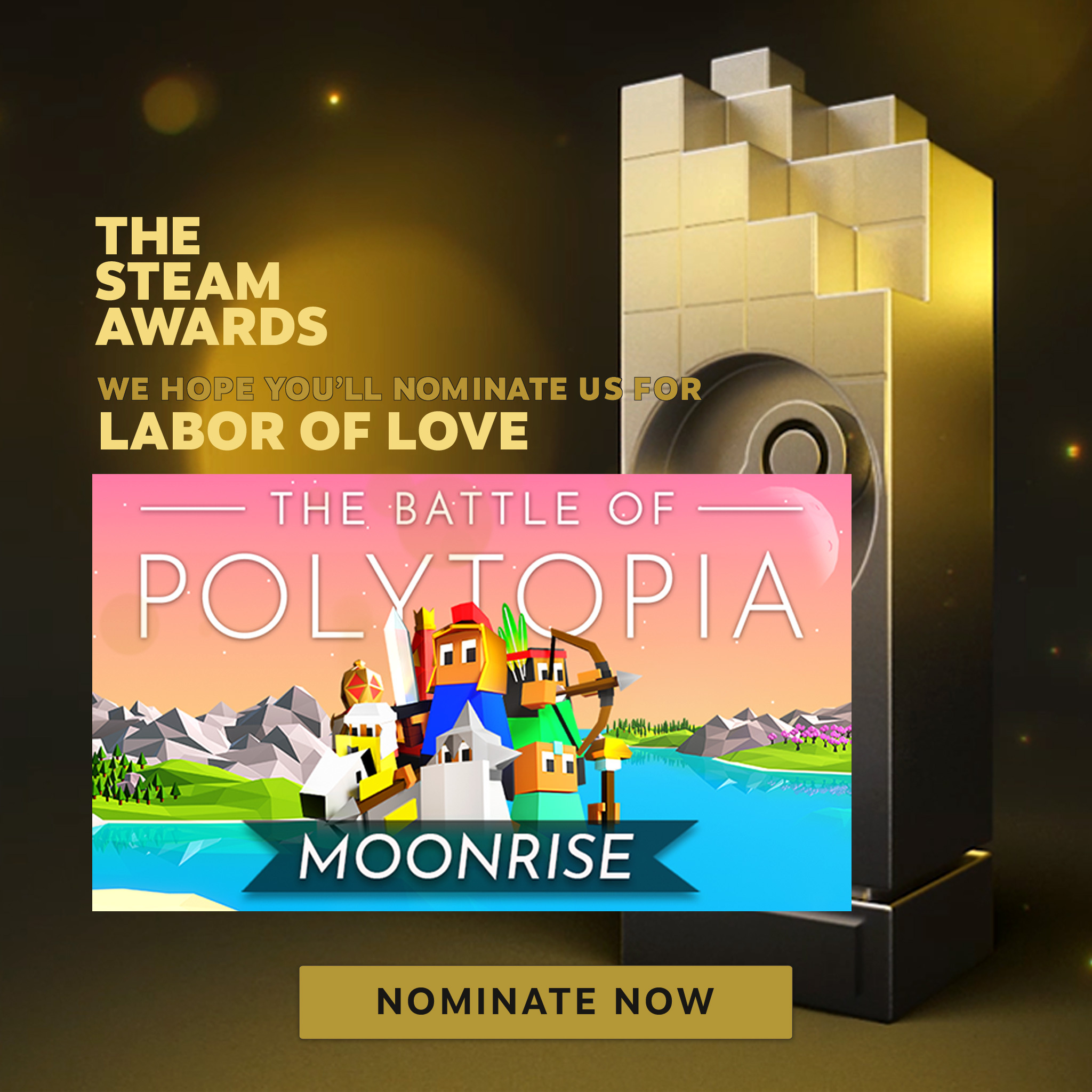 Want a new way to show the world how much you love Polytopia? You're in luck, as the Steam Awards are happening soon, and you can nominate us for the Labor of Love Award! To vote - Simply go to our Steam Page and vote!