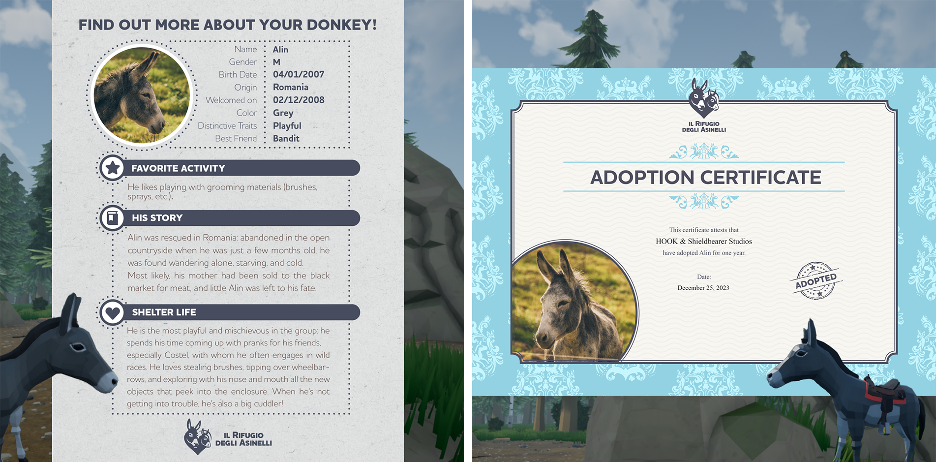 We have adopted a beautiful and joyful donkey from an Italian shelter (โIl Rifugio Degli Asinelli", Italian base of โThe Donkey Sanctuaryโ) for the entire year; his name is Alin, but to us, he embodies the spirit of Ferguson that we all want to bring along on our adventures.