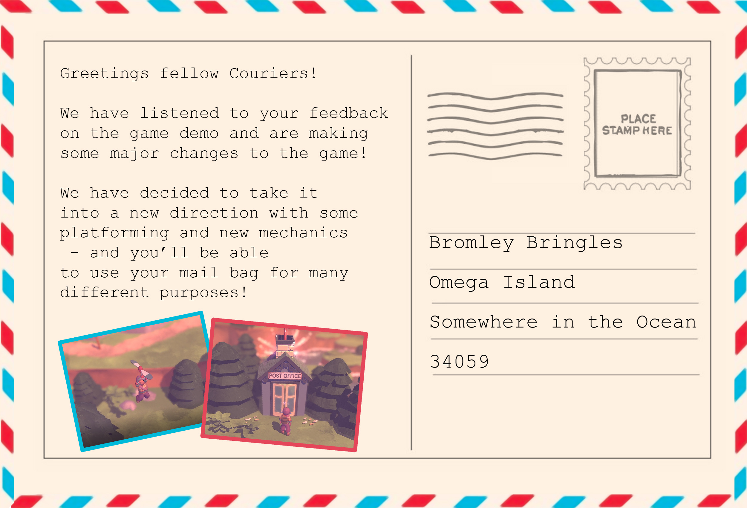 Hello our little couriers in training! We're pleased to announced that The Courier demo is now available on Steam! Explore the wonderful island of Orda in The Courier Demo! Walk your dog, ride a bicycle, deliver the mail. Meet friendly characters and help them do their chores! Give the Courier Demo a try!https://store.steampowered.com/app/1933200/The_Courier_Demo/ 📨