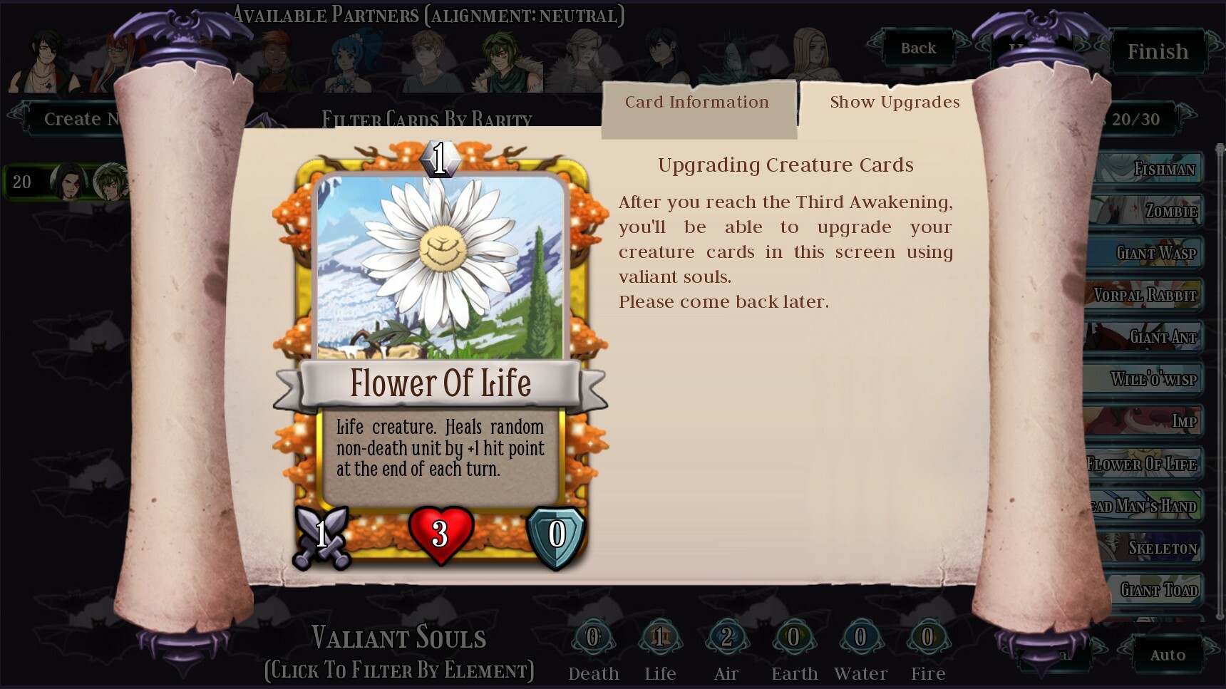 - added a "Back" button to go back to the map when you start a mission and are on deck screen should you change your mind - moved the "Suggest Cards" to the bottom near the "Clear" deck and renamed it to "Auto" to make space for the new "Back" button - updated the tutorial texts to reflect the changes - now you can choose your partner in the deck screen by just clicking on the portrait. You no longer have to deselect the current partner and then select a new one - this fixes some issues when entering a fight where a hero can't be used, forcing you to use new deck button (not very clear) - added information in the card itself about the upgrading system, now will display some info if you try to upgrade before the Third Awakening (when it unlocks the upgrading feature) - now the mana cost of the cards is displayed also in the deck building screen