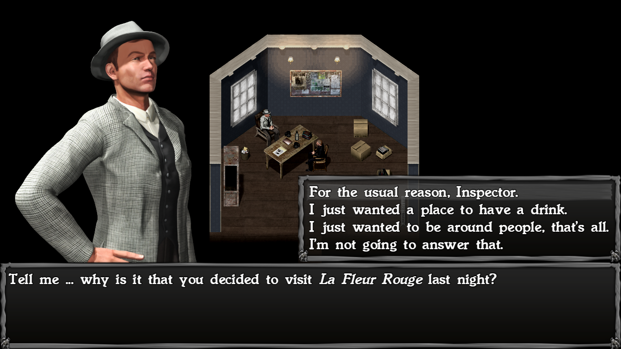 So, you've committed the crime and now you're hoping to get away with it. After a brief introduction, the inspector will ask you questions about your background and then run through all of your actions from the previous evening, focusing mainly on the conversations you've had with the other occupants of the brothel. If you've played the previous games, this should all sound quite familiar.
