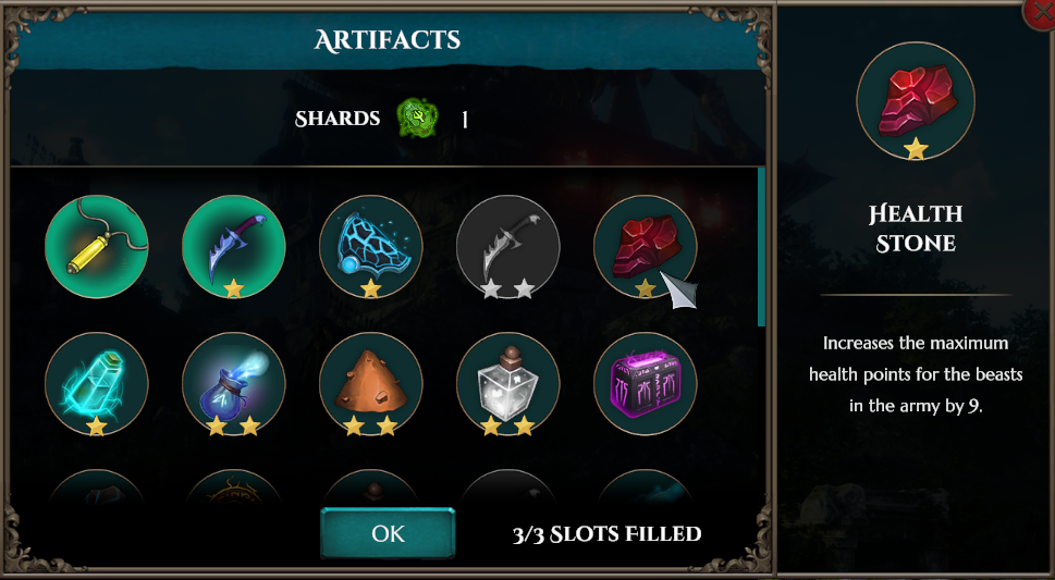 Because of the diversity of artifacts available, some may suit certain situations better than others. For example, Radiant Light increases the commander’s view range to aid in exploration and planning, while Shield of Might increases the shield value of all beasts in the army to give you a defensive edge in battle.