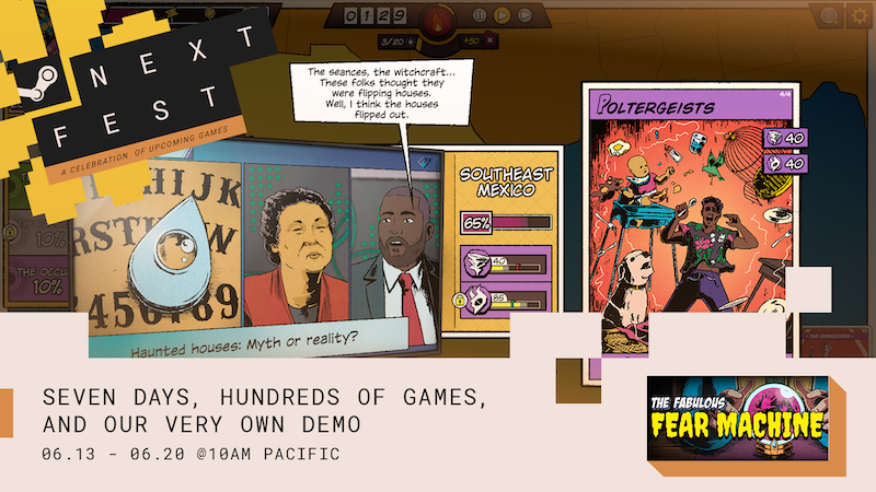 Steam Next Fest is a multi-day celebration where fans can try out demos, chat with developers, watch livestreams, and learn about upcoming games on Steam. The Fabulous Fear Machine's demo will be available for anyone to download during Next Fest.