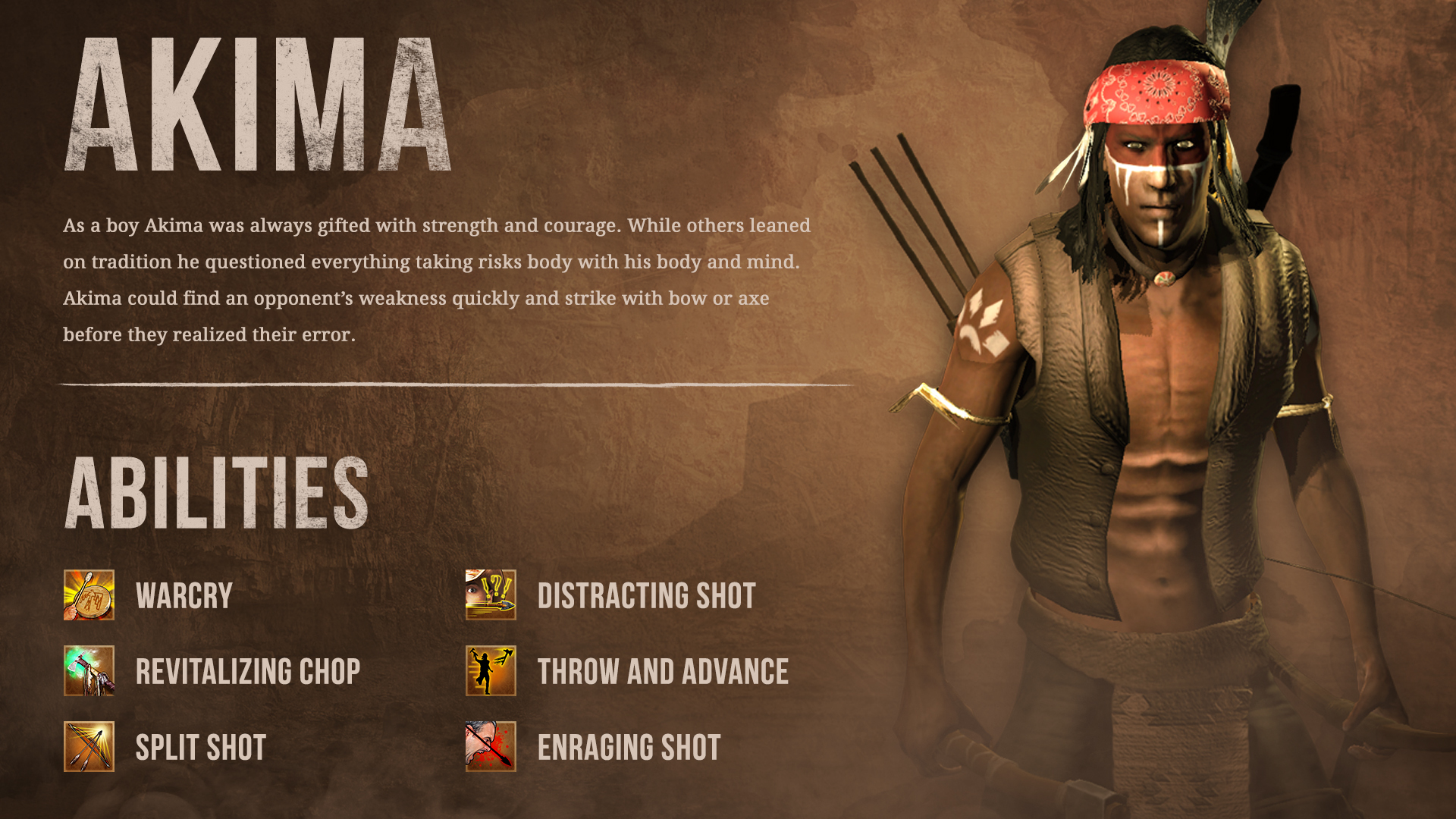 Along the course of Feud’s development there were many characters that narrowly missed making it into the game. We’re happy to bring to you one of those characters finally. Akima plays very differently than the other heroes thanks to his bow and his focus on managing enemies in a more “tank” style of play. His powerful Warcry ability can draw enemies attention. You can choose to spec Akima into a ranged focus character, melee focused character or a mix of both. Using his melee focus you can use abilities like Throw and Advance to close the gap and then combo it into Revitalizing chop for a devastating amount of damage. If you choose to keep him range centric his attacks can confuse enemies and draw them to Akima.