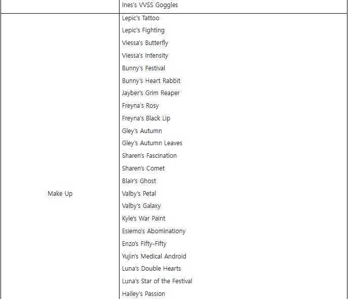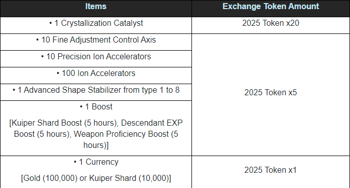 - The list below shows items available throughout the event period for exchange.