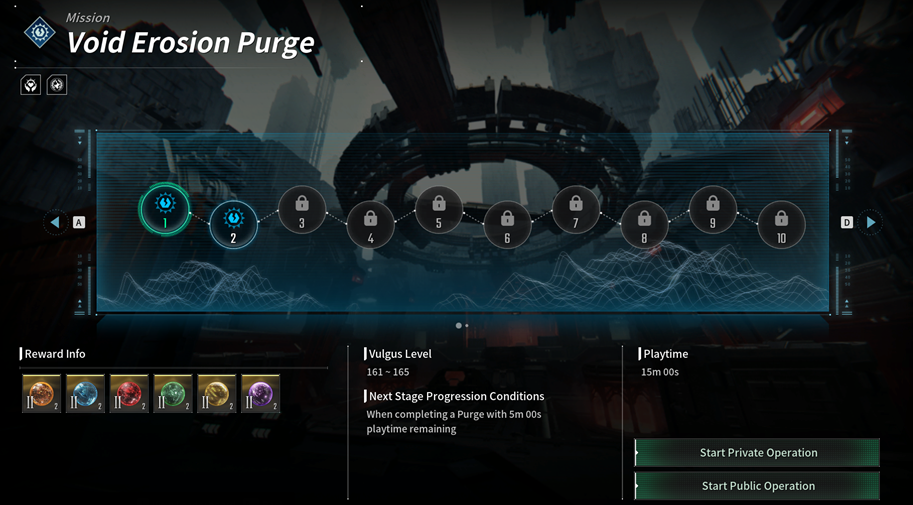 - Erosion Purge Complete: If you complete the mission in the target time of 10 minutes, you will receive the rewards and unlock the next stage. - Mission Complete: If you complete the mission but exceed the target time of 10 minutes, you will receive the rewards, but the next stage won't be unlocked. - Mission Failed: If you fail to complete the mission and exceed all 15 minutes of playtime, you will not receive the rewards, and the next stage won't be unlocked.