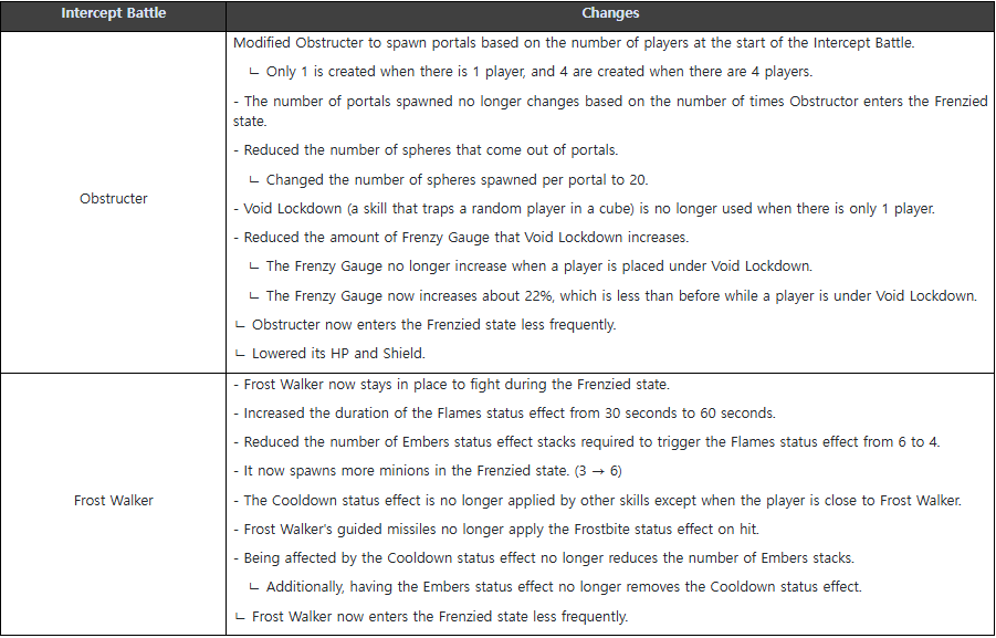 - The Obstructer and Frost Walker Intercept Battles can now be entered alone when there are no matched players. - Improved the Obstructer and Frost Walker Intercept Battles to allow Private interceptions. - Changed Obstructer and Frost Walker as below.