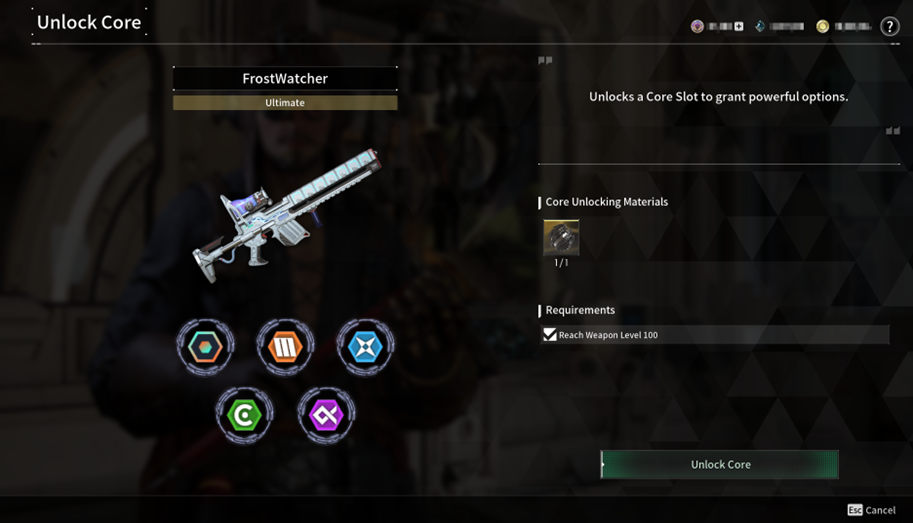 - When you unlock a Core using the correct weapon and Core Binder that meet the conditions, 5 Core Slots will be unlocked. - Each slot has an assigned core type. The assigned type unlocked depends on the weapon used, and you may have several of the same type. - You can equip Core items assigned by the Core slot type, and it also determines the type of option. - Weapons with unlocked Cores cannot be dismantled or sold.