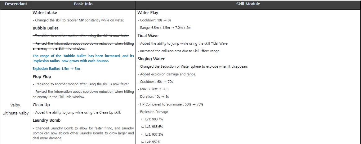 PST 2025.01.15 (Wed) 22:00 – Hotfix 1.2.4 > Content Improvements > (5) Descendants > The skill information for ‘Valby’ and ‘Ultimate Valby’ regarding the ‘Bubble Bullet’ skill has been updated.