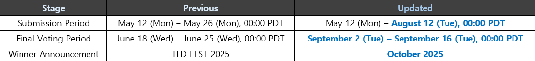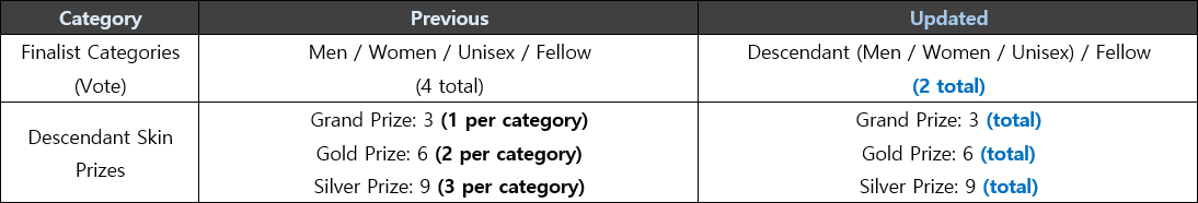 Greetings, Descendants! The submission period for the 2025 Skin Contest, which began on May 12 (Mon), has been extended to allow for greater participation and creativity. We hope this change will give all Descendants more time to finalize and submit their designs. In addition, the award criteria for Descendant skins have been updated. Instead of selecting finalists by gender categories (Men / Women / Unisex), all Descendant skin entries will now be reviewed under a unified selection format. This update aims to reduce the burden on participants and encourage a wider range of creative submissions. Please note that we have identified several entries that do not follow the official submission guidelines. To be considered, entries must be submitted using the official template. Submissions consisting solely of screenshots or standalone illustrations without the template will not be eligible for finalist selection. Please refer to the details below for full information on the schedule changes and award updates.■ Updated Event Schedule ■ Award Criteria Changes - If the number of submissions or qualified entries is limited, the number of finalists and winners may vary by category (Descendant / Fellow). - If no entries meet the minimum finalist criteria in a specific category, no finalists may be selected for that category.■ Submission Guidelines - Please download the appropriate template based on the skin category you are entering and follow the instructions. [Guidelines] [Download Template] - Submissions that include only screenshots or standalone images without the template will not be considered for finalist selection. We look forward to your creative participation in the 2025 Skin Contest. Thank you. (Updated) 5/16 (Fri) – 5/22 (Thu) Results of the Crackdown on Abusive Users May 23, 2025