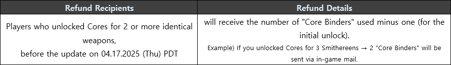 "Core Binders" used for multiple Core unlocks on identical weapons prior to the update, will be refunded.