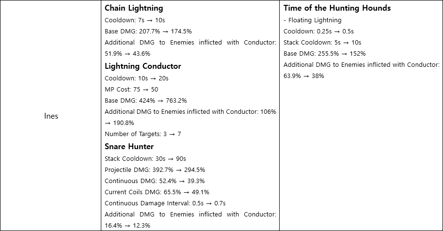 Content Improvements (1) Descendants - Fixed Ines' Chain Lightning and Floating Lightning to no longer attack targets that are blocked by terrain. ㄴ Chain Lightning and Floating Lightning are removed if they hit terrain. - Fixed an issue where the tooltip for Bunny's Electric Condense skill module did not reflect the Skill Power Modifier increase in damage.