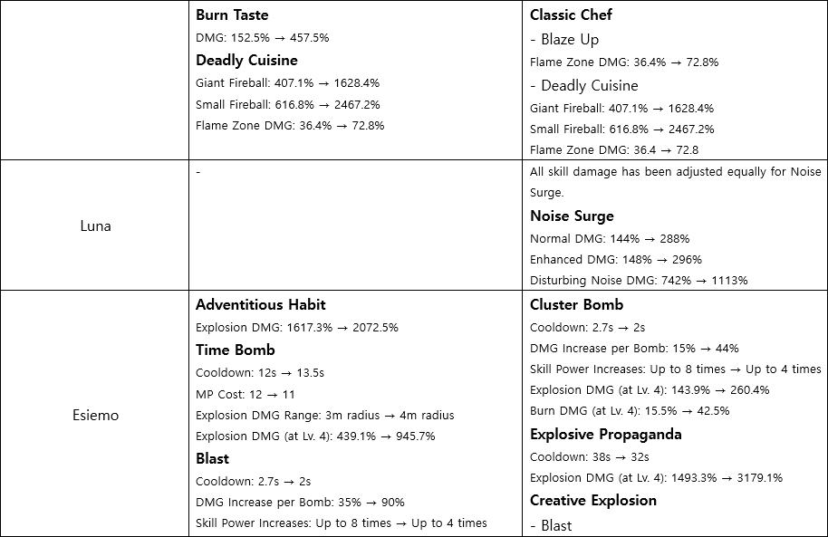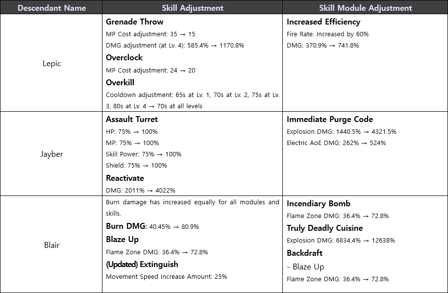 This rebalance focused on strengthening relatively underperforming Descendants, using as basis the performance of Viessa, Valby, and Hailey, who are the current baseline. However, we recognize that for some Descendants, simply tweaking some numbers are not enough to bring out the best in them. We believe that the mechanics of certain skills may need to be reworked to achieve more meaningful performance improvements, but we had to adjust multiple Descendants simultaneously and we apologize for focusing on numerical balancing this time. We understand that you may find some changes inadequate because of that, but we'll continue to review and implement improvements to skill structure and design.