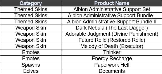 (4) Other - Fixed an issue where the Descendant's hand would appear unnatural when equipped with The Last Dagger's weapon skin, Dark Nebula. - Fixed an issue where the Inversion Reinforcement effect Hyperdimensional Vision's cooldown was not being applied. - Fixed an issue where objects summoned during missions could not be damaged with launcher weapons. - Fixed an issue where the wings on Serena's "Albion Administrative Support" body skin were not affected by paint.