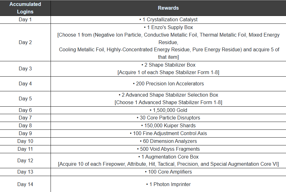 ■ Blair Ready for Deployment ■ Event Period: After the 04.03.2025 (Thu) update - 04.30.2025 (Wed) 23:59 PDT - Event Content: Depending on the number of days you've logged in, you can earn various rewards. ※ The event rewards will be sent to your Mailbox. ※ You may receive Attendance Rewards by logging in again after reset (00:00 PDT).