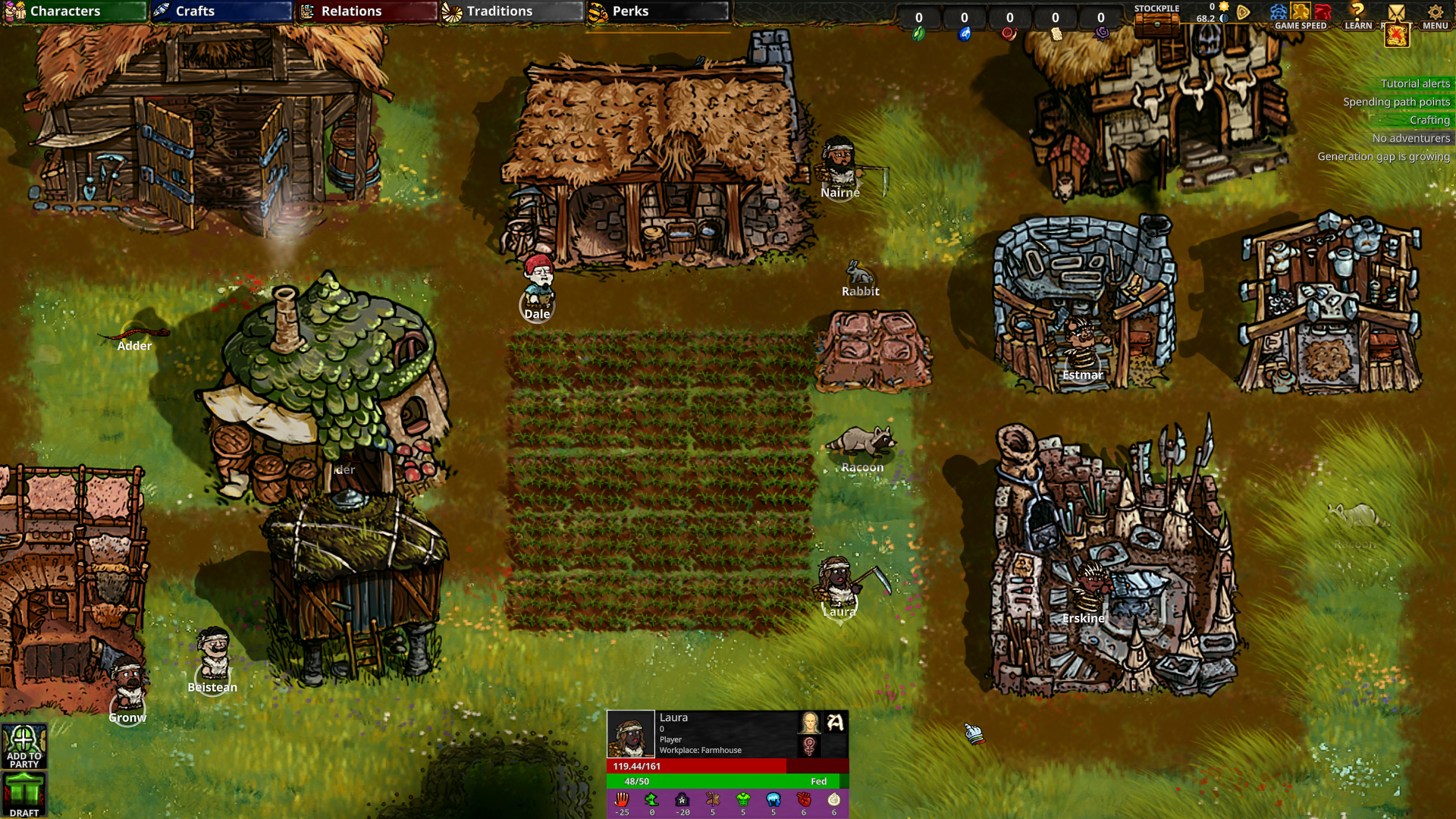 ːhappyhfː [Content] New constructions: Pantry, Warehouse, Butchery, Cookery. ːhappyhfː [Content] New profession: Butcher. ːhappyhfː [Content] New resource: Meat. ːhappyhfː [Content] New food: Fine Meal. ːhappyhfː [Content] Added roof to Cookery construction. ːhappyhfː [Content] Added a new interaction animation to the Over Earth construction. ːhappyhfː [Art] New outfits for all jobs. ːhappyhfː [Art] Increased the resolution of current and recent constructions, painting additional details to improve quality. ːhappyhfː [Balance] Character trait levels now start from 0 instead of 1. ːhappyhfː [Balance] When a character's trait experience reaches a certain level, it now resets to zero. ːhappyhfː [Balance] New food tier replenishment rates: 10/15, 20/25, 30/40, 40/60, 50/80. ːhappyhfː [Fix] Refactored definition reference replacers for alerts, notifications, decisions, items, paths, and character presets. ːhappyhfː [Fix] An issue that prevented adding objects to faction stockpiles on map maker has been resolved. ːhappyhfː [Fix] Fixed an issue with character trait level-up calculation. ːhappyhfː [Fix] Fixed a problem with the requirement database that caused an error when a popup was launched. ːhappyhfː [Fix] Another issue with prerequisite database popups has been resolved. ːhappyhfː [Fix] Fixed a bug in the trait database LevelUpRule field that prevented popups from being opened more than once. ːhappyhfː [Fix] Fixed a bug that prevented the requirement popup from opening for prerequisite types that have yet to be refactored. ːhappyhfː [Fix] Fixed a problem that occurred while closing decisions after altering them.
