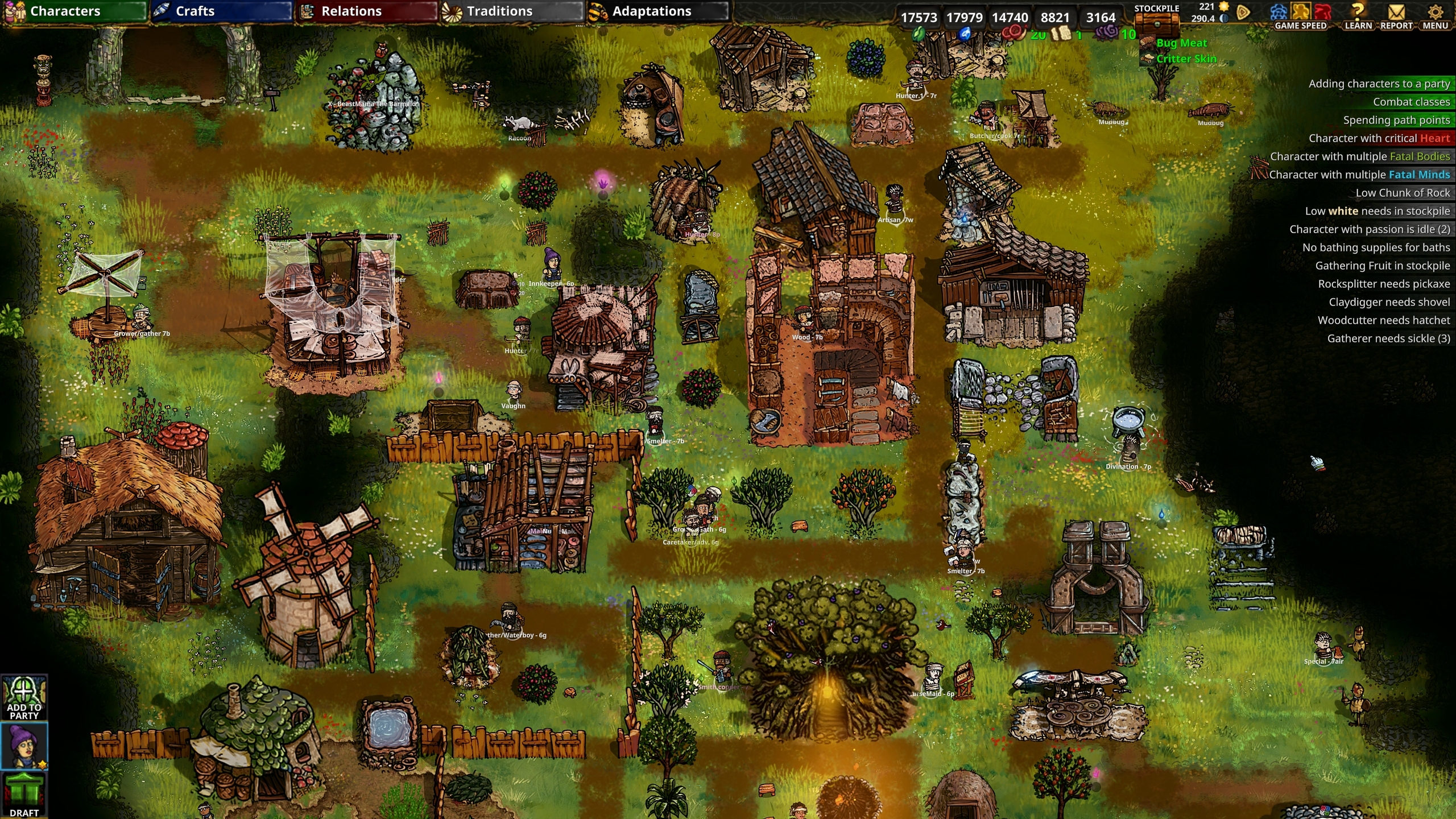 ːhappyheartː [Feature] We now have saturation levels for each character thanks to the connection between the game mechanic of eating and the energy mechanic controlling characters' food requests. ːhappyheartː [Feature] Implemented hungry characters starting eating and consuming food. ːhappyheartː [Feature] The new path rewards system has been implemented. A new clickable reward box appears when a trait is leveled up, allowing the player to select a reward based on the trait that gained the level. ːhappyheartː [UI/UX] The character detail panel has been revamped. We now exhibit characteristics that gain experience and character energy. ːhappyheartː [UI/UX] Refactored character stats. Removed Path Points, Moira, Rigor, Insight, and Fortitude from the game. Stride has been renamed to Movement Speed, Power to Damage Power, Resistance to Block Chance, Perception to Vision Radius, Wit to Cast Speed, and Haste to Action Speed.