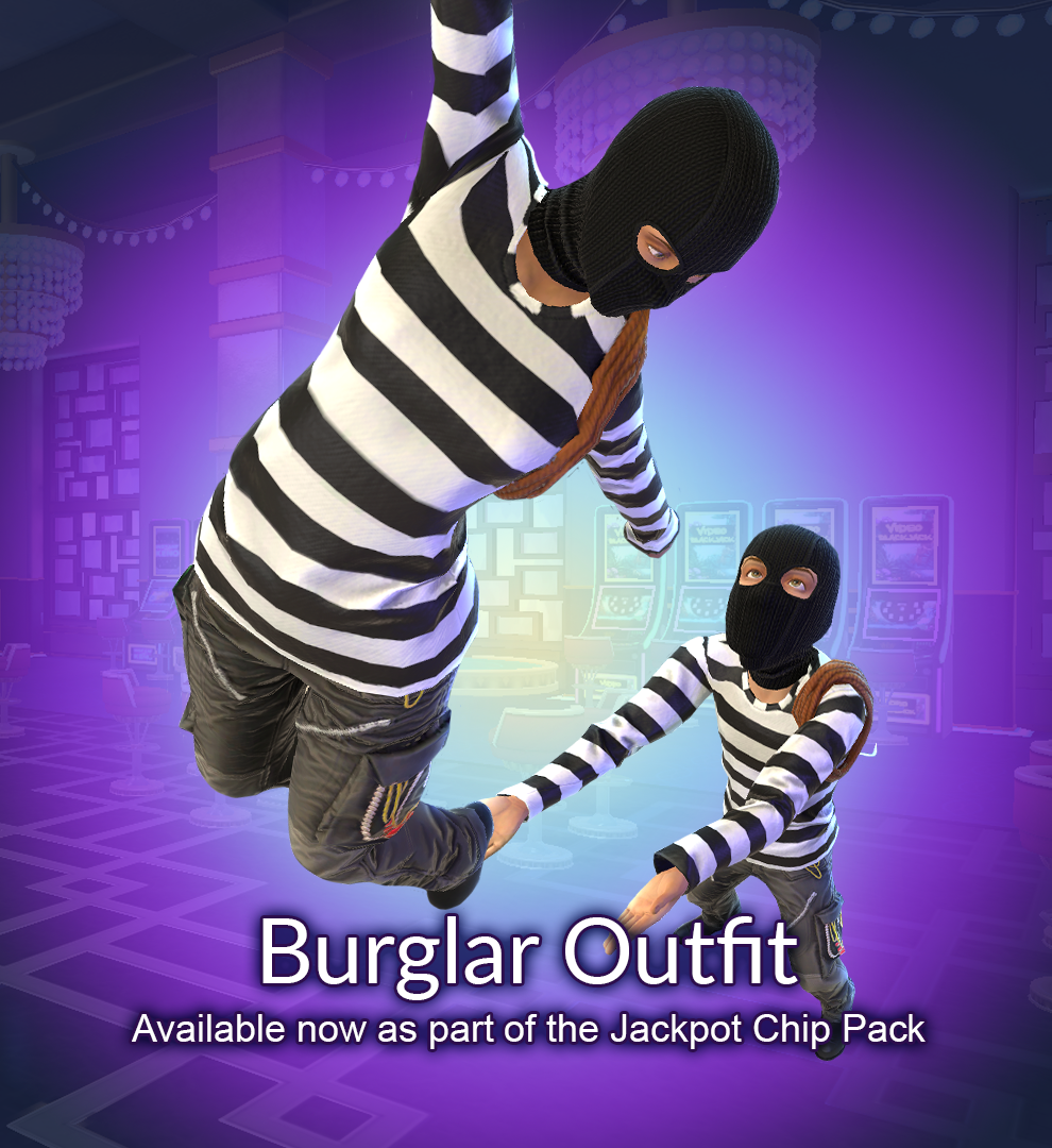 September's Jackpot Pack is a real steal! Nab it from the Cashier this month and in addition to a haul of 1,000,000 chips, you'll also get your hands on the exclusive Burglar Outfit as a bonus! It won't let you steal chips, but you might feel a bit more devious winning chips from other players at poker.