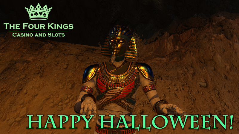 An ancient curse has been visited upon The Four Kings Casino and Slots - the Mummy Costume and other returning Halloween items have been unearthed at the Crown Jewels and Masquerade stores! Also available is the Vampire Costume with this month's Jackpot Reward from the Cashier.