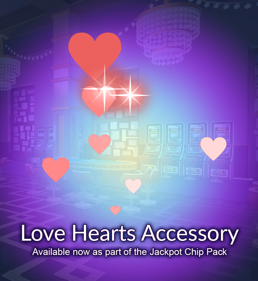 February is here, love is in the air...and that's literal with this month's Jackpot Reward! The Love Hearts Accessory will emit a steady stream of lovely sparkling hearts from your avatar when equipped. Get it with the Jackpot Chip Pack as an exclusive bonus item, all February long at the Cashier!