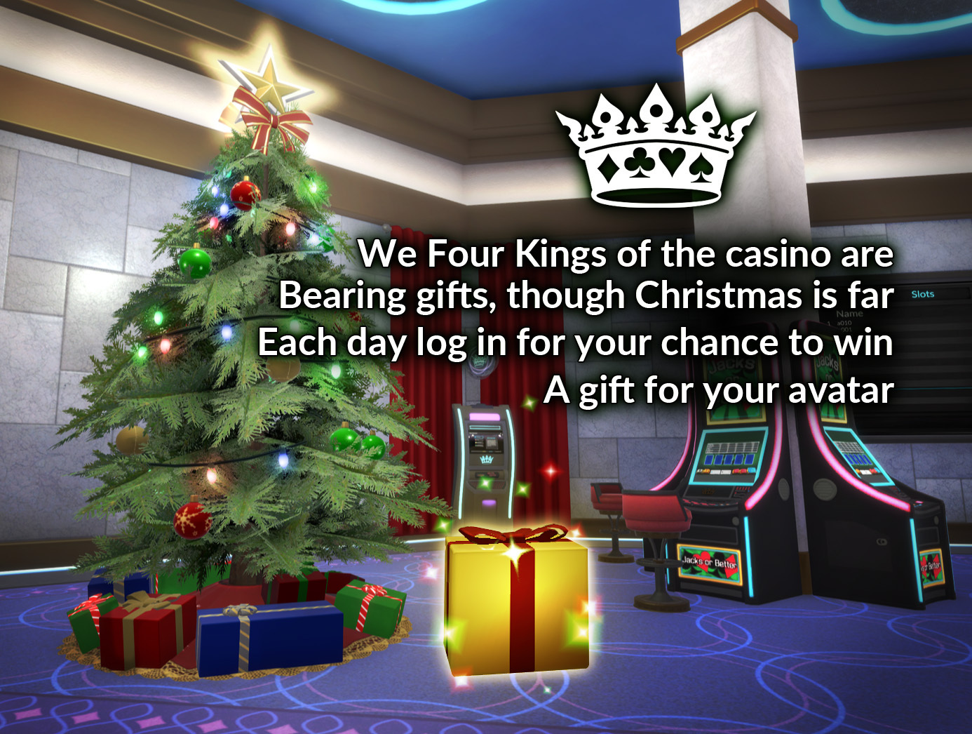 The holidays have once again arrived at the Four Kings Casino! The Christmas tree can be found in the Lobby once again, with presents making regular appearances under it for players to unwrap in place of the usual hidden chips. When you see a notification for hidden chips, check under the tree and unwrap your gift!
