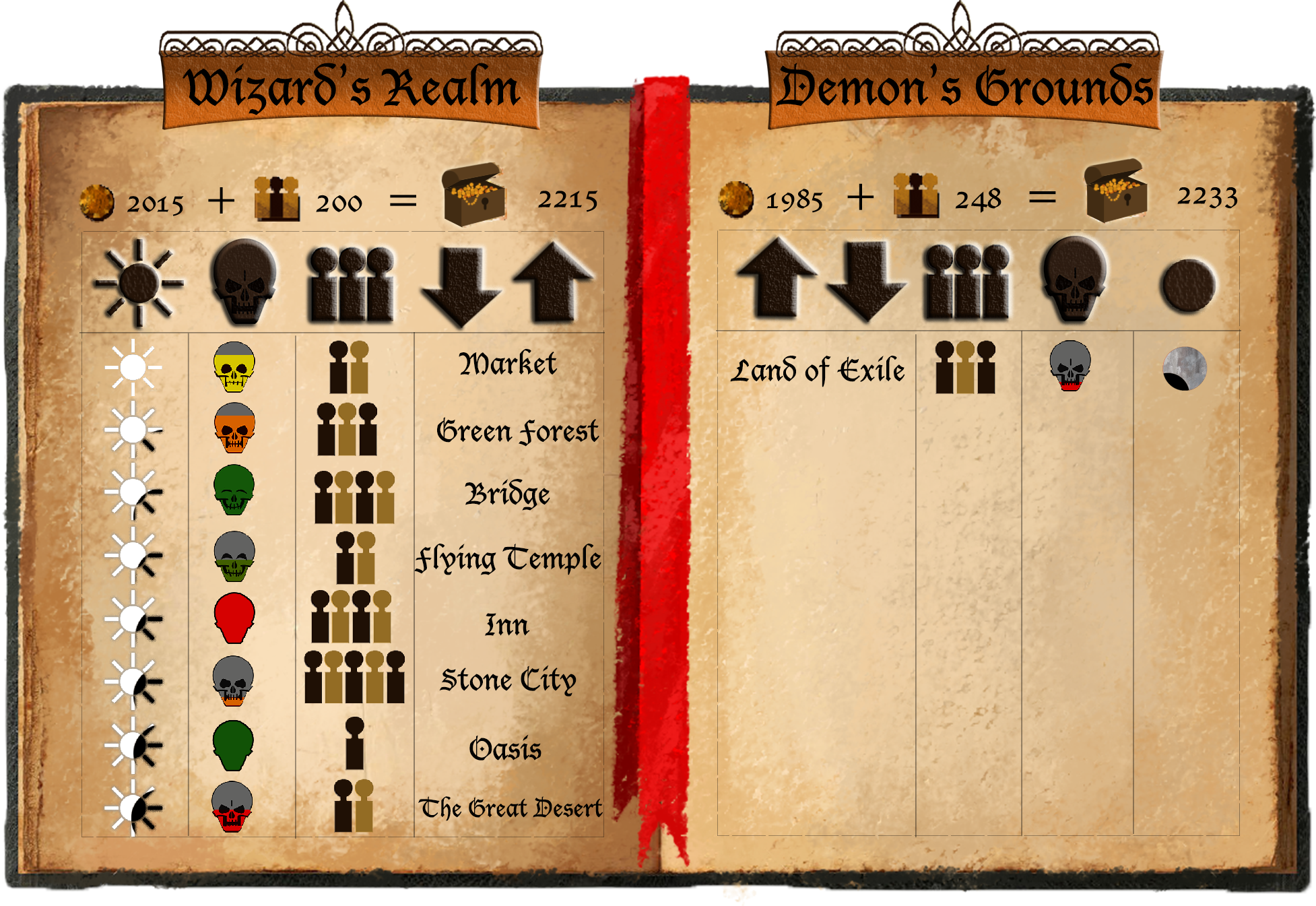 When creating ststistics screen our main goal was to visualize as all numbers and indicators, so that player could understand influence level or moral level of specific location, just by looking at icons, such as: diffent states of rising sun for influence of light, different phases of moon for influence of darkness and different emotional states of skeleton head icon for indicating moral state of inhabitants.