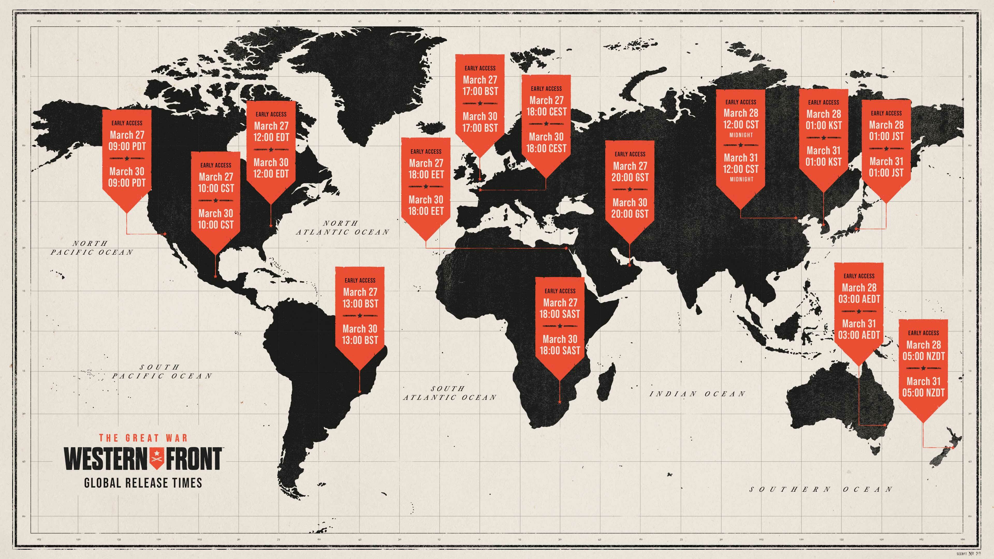 We trust you are as excited as us for the full release of The Great War: Western Front later today. To confirm, the release is scheduled for 17:00 BST. For Europe, East US and West US, this means: