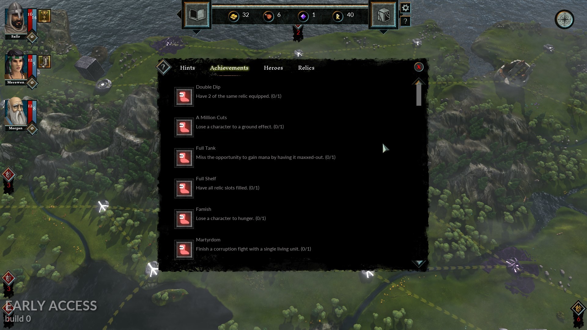 The heroes tab lists the unlocking progress of all your heroes. Our first implementation of this was a dead button that just showed a tooltip with all this information in it, which was… not particularly good :D Knowing we’d have to add an achievement tab anyway, and they both use the same underlying system for unlocking rewards, it was a simple thing to just use the same layout for the heroes. Note here that while Morgan is unlocked (by default), his Prowess is still locked. It has a temporary description here, but the idea is you have to start and finish the game with a hero in order to unlock his Prowess.