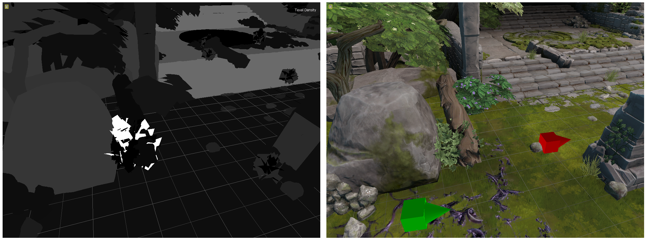Imagine a small rock, which uses up a small area on the screen, say 100x75 pixels. It makes no sense to apply a 2048x2048 texture to it, right? You can't even see those pixels. So, I created a tool in our Editor to visualize texture density in shades of gray. The lighter the image, the higher the density. That made it easy to spot light (dense) spots in any scene, at a glance.