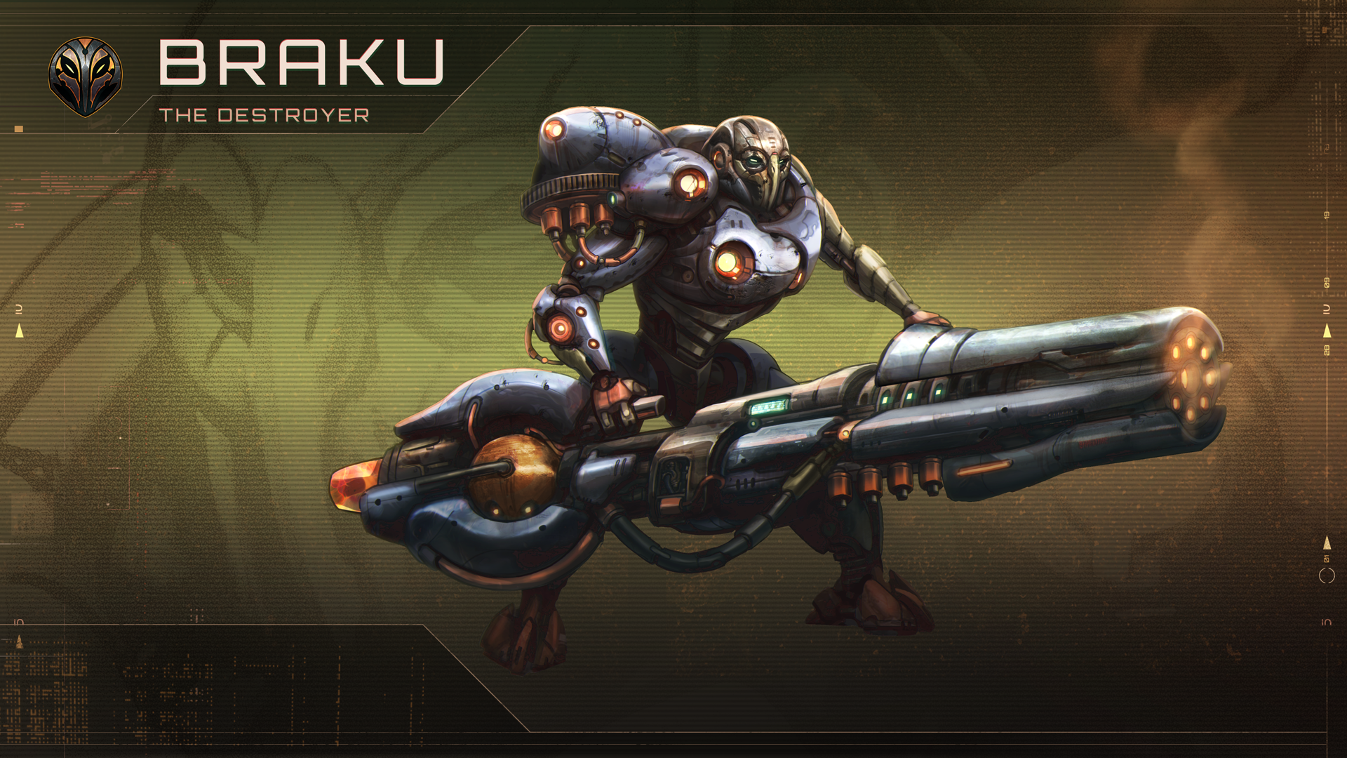 This robust and lethal relic of war is the mechanical representation of the INSINYUR, a species for which hand-to-hand combat is totally out of its possibilities. Among their creations, BRAKU is the longest-lived and with the fewest systemic failures recorded. This surprising condition is suspected to be due to BRAKU's continued exposure to the essence of O'Ree-Jin.